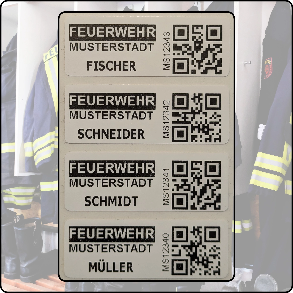 Ja, die Etiketten können auf Jacken, Hosen und anderer Feuerwehrkleidung angebracht werden. Sie haften sicher und sind für die typischen Anforderungen von PSA optimiert.